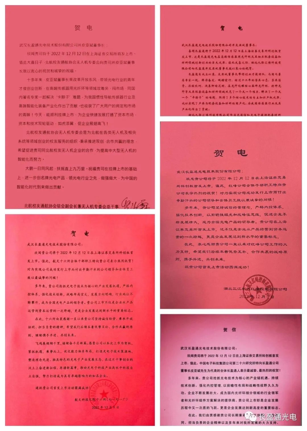 长盈通作为国内光纤环产业的先行者及领军者,其相关产品属于国防工业重要基础元器件和“卡脖子”领域,光纤陀螺环绕环机、陀螺组件等产品被列入国外出口管制清单,公司长期致力于该领域的技术研发突破,保障军工配套,推动光纤陀螺工程化、产业化发展,积极为国防安全事业贡献力量。欣闻长盈通上市,公司客户、行业协会、媒体等各界朋友纷纷发来贺电送上祝福,分享喜悦。